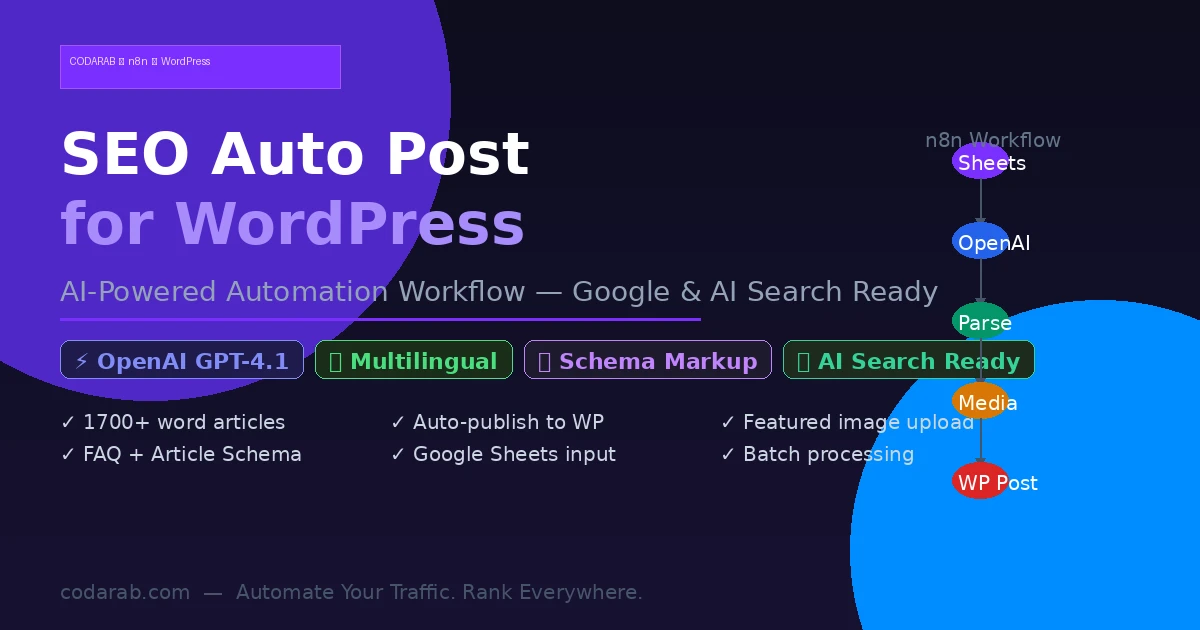 CODARAB n8n SEO Auto Post is a production-ready n8n automation workflow that reads your article titles from a Google Sheet, sends them to OpenAI, and fully generates then publishes SEO-optimized WordPress posts — including featured images, categories, tags, schema markup, FAQ sections, and internal links — all on autopilot. One run. Hundreds of articles. Zero manual writing.